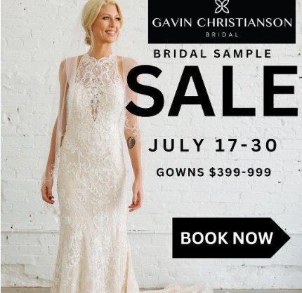 Book your bridal appointment during the National Bridal Sale going on July 12-20 at Gavin Christianson Bridal! Our Sample Sale Collection during this special event will be $399-$1199! Book your appointment and reserve your bridal appointment today!